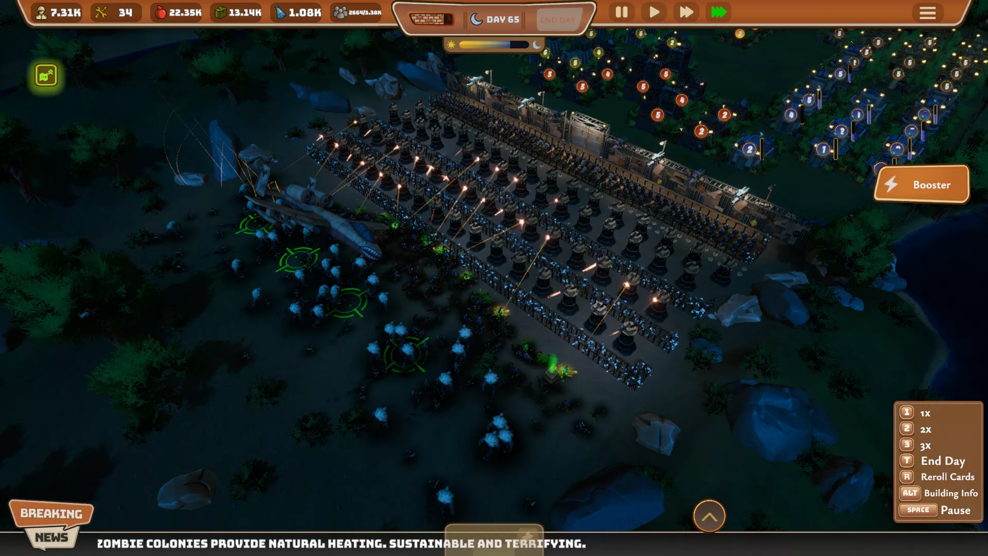 Durante el día, construye tu ciudad, gestiona sabiamente los recursos y refuerza tus líneas de defensa. Pero cuando cae la noche, todo cambia. Oleadas de zombis atacan para destruirte. Cada noche es más desafiante, y cada decisión más crítica. Prepárate, porque en la oscuridad nadie está a salvo.