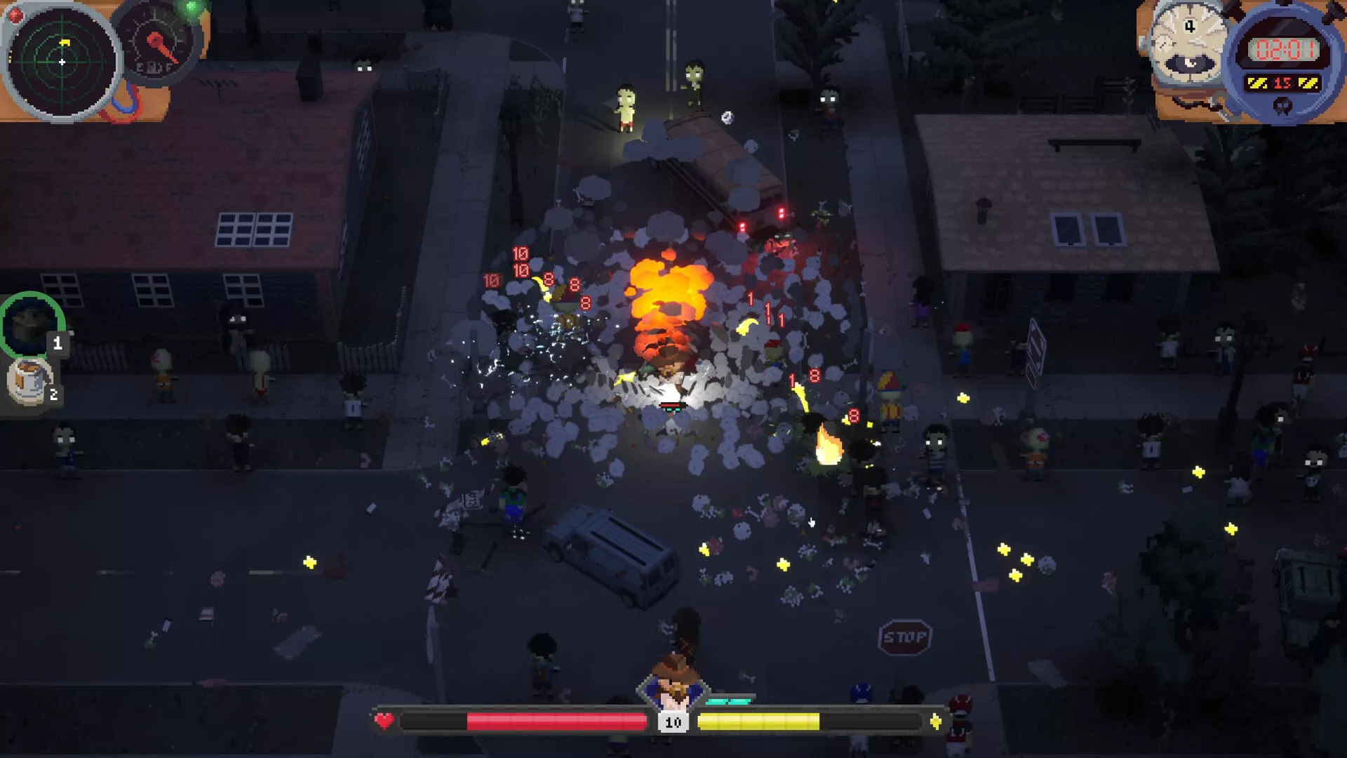 Cada arma y objeto ocupa bloques en tu mochila. Organízalos de forma que sus efectos por proximidad se acumulen, y así potencien tus armas para convertirte en la máquina de matar zombis definitiva.