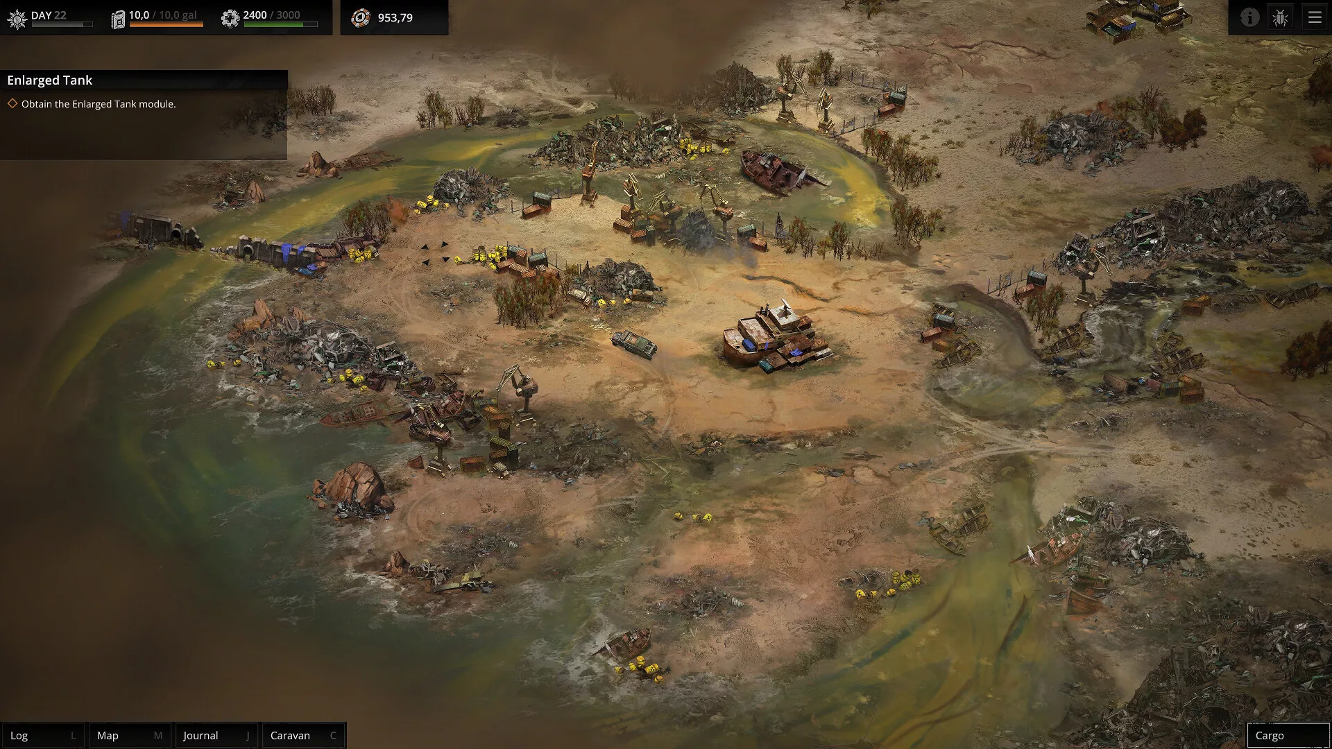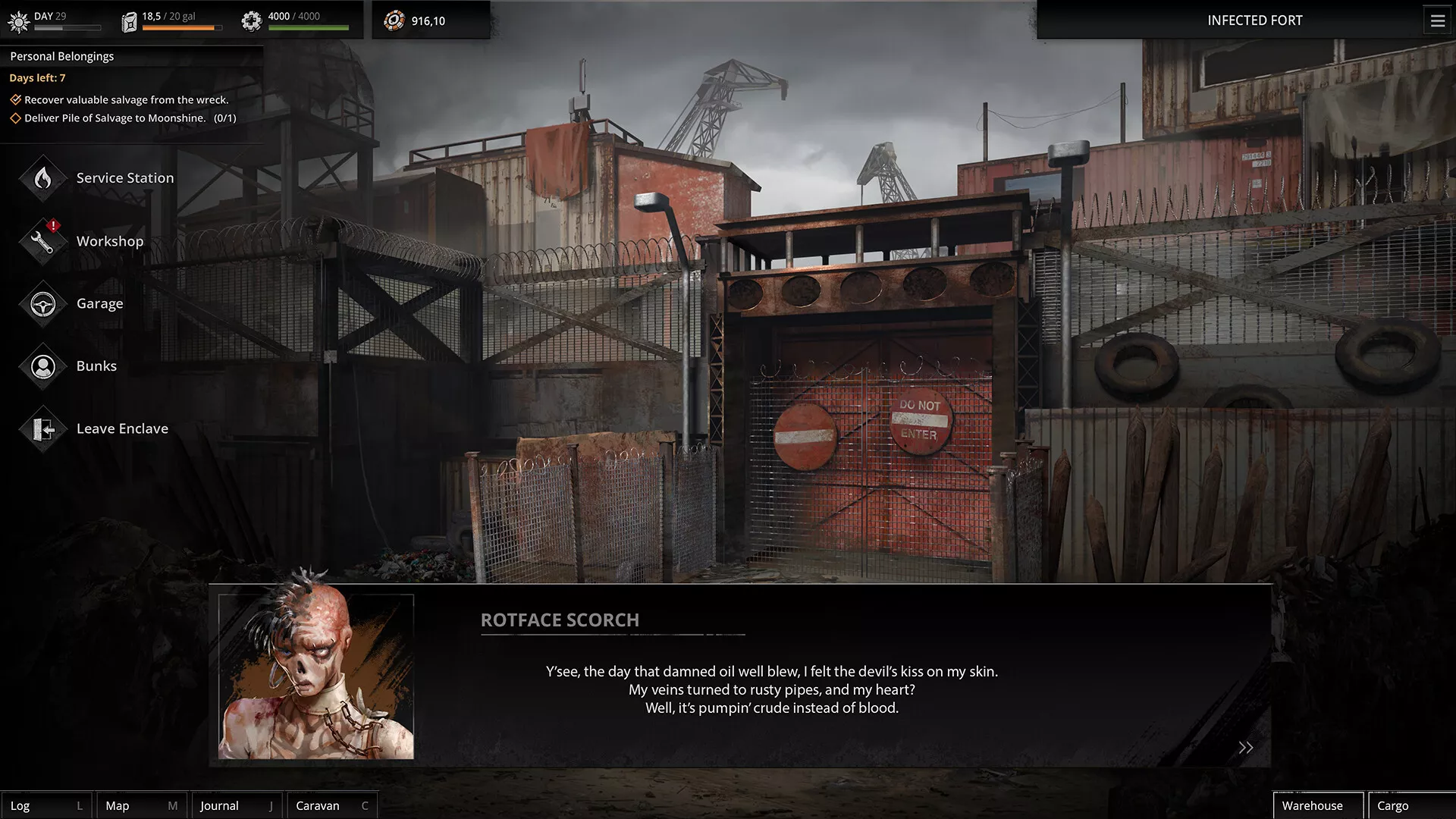 "No todo salió como estaba planeado. Tarde o temprano, el control de la refinería se te podía escapar de las manos. Y, bueno... lo hizo. El mortífero ataque de la Hoja serrada te lo arrebató todo. Tu amigo Victor ya no está, así como el combustible, el equipamiento y la tripulación. Es hora de montar el primer vehículo utilizando chatarra, conseguir una nueva tripulación y volver al lío. No hay tiempo que perder, pues la Gran Tormenta se acerca.