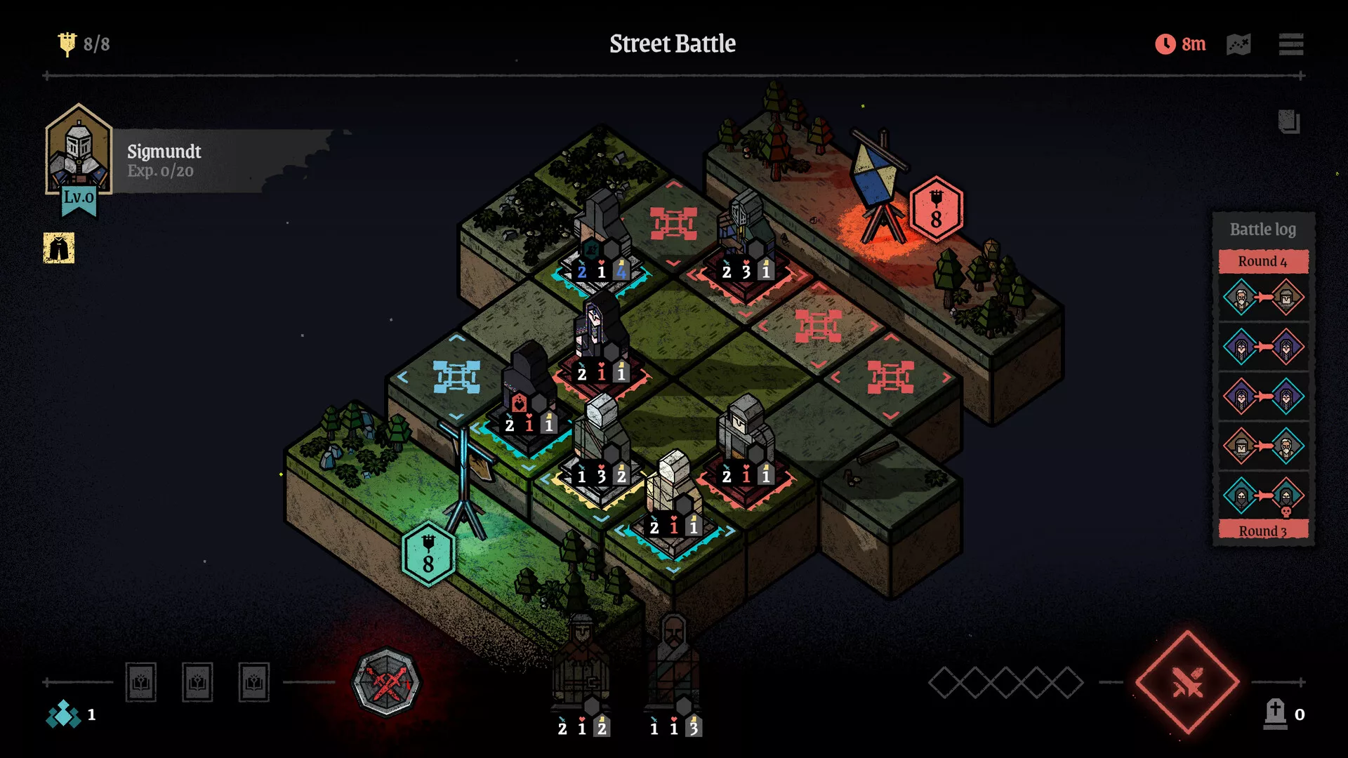 En cada ronda, utiliza tus puntos de acción para desplegar mercenarios en el campo de batalla. Una vez iniciado el combate, actuarán automáticamente según su velocidad, así que coloca tus unidades con sabiduría durante la fase de despliegue.