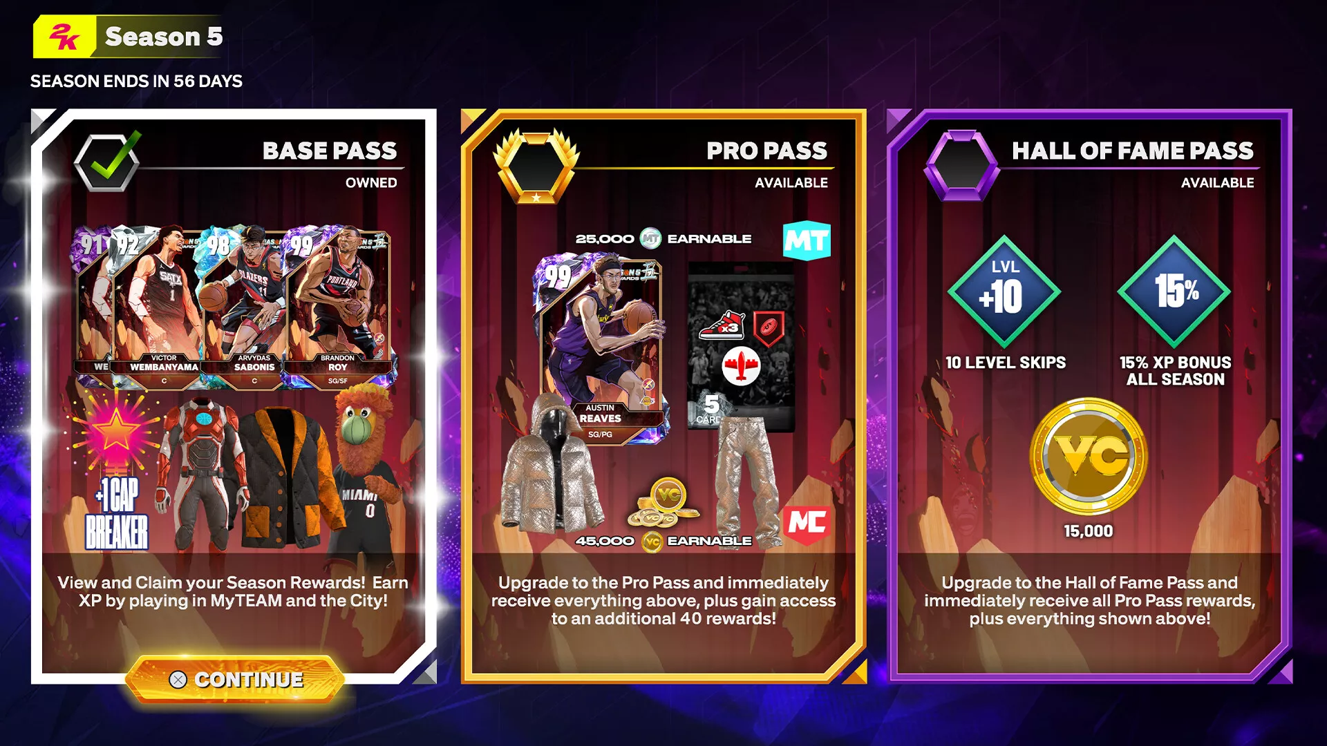 El Pase del Salón de la Fama: Temporada 5 de NBA 2K25 lleva tu experiencia Mi CARRERA y MyTEAM al siguiente nivel. El Pase del Salón de la Fama: Temporada 5 incluye todo lo del Pase Pro (acceso a 40 niveles de recompensas prémium y 5 Recompensas del Pase de Temporada adicionales), un Potenciador del 15 % de EXP para toda la temporada y 10 Saltos de Nivel aplicados inmediatamente a la pista de recompensas de la Temporada, ¡además de 15.000 VC!