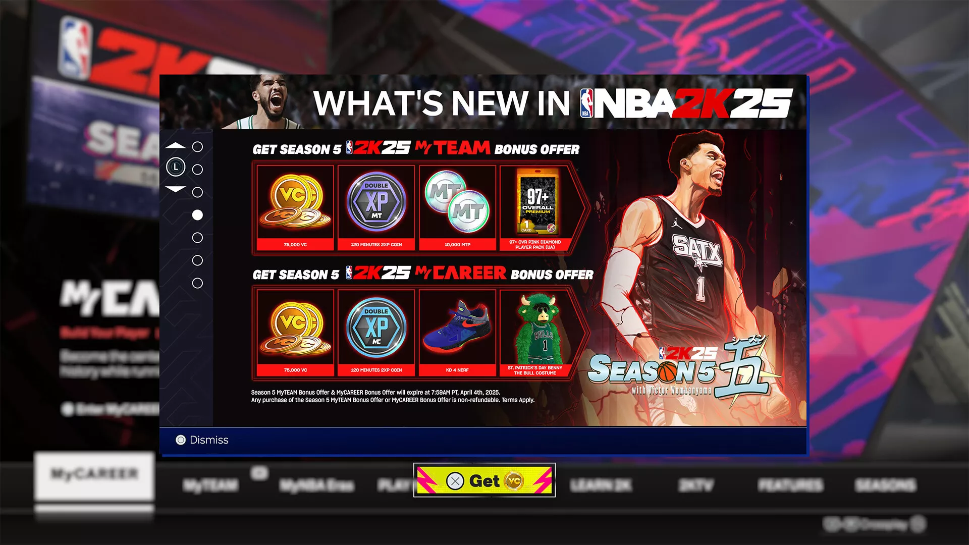 La Oferta de Bonificación de Mi CARRERA de la Temporada 5 de NBA 2K25 incluye los artículos siguientes: