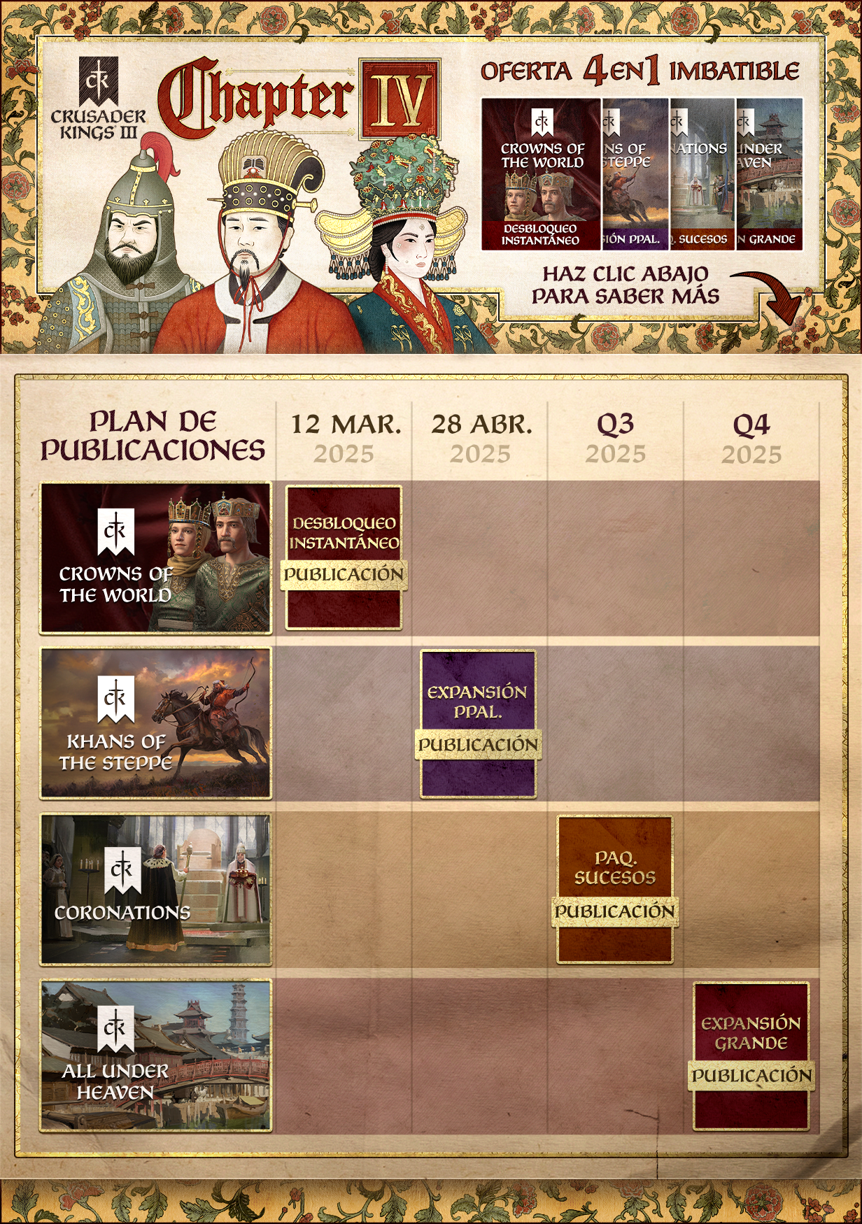 El Chapter IV de Crusader Kings III te invita a explorar los conflictos de la vida nómada y el esplendor de Asia Oriental. Con una gran selección de contenido que se irá publicando a lo largo de 2025, Chapter IV presenta nuevos desafíos, sistemas y opciones de personalización que dotan al juego de una mayor profundidad y amplían el mapa de formas tan novedosas como emocionantes.